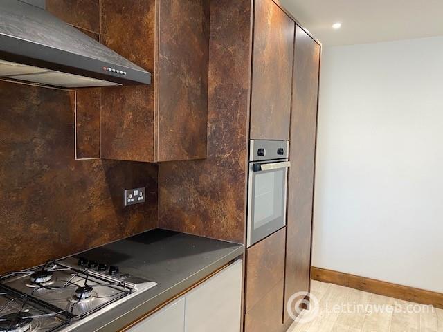 Kitchen: (15' x 8') Smart kitchen comprising grey and wood effect base and wall units with worktops and splashback. Electric oven, gas hob and extractor hood. Vinyl flooring. Window to the front.
