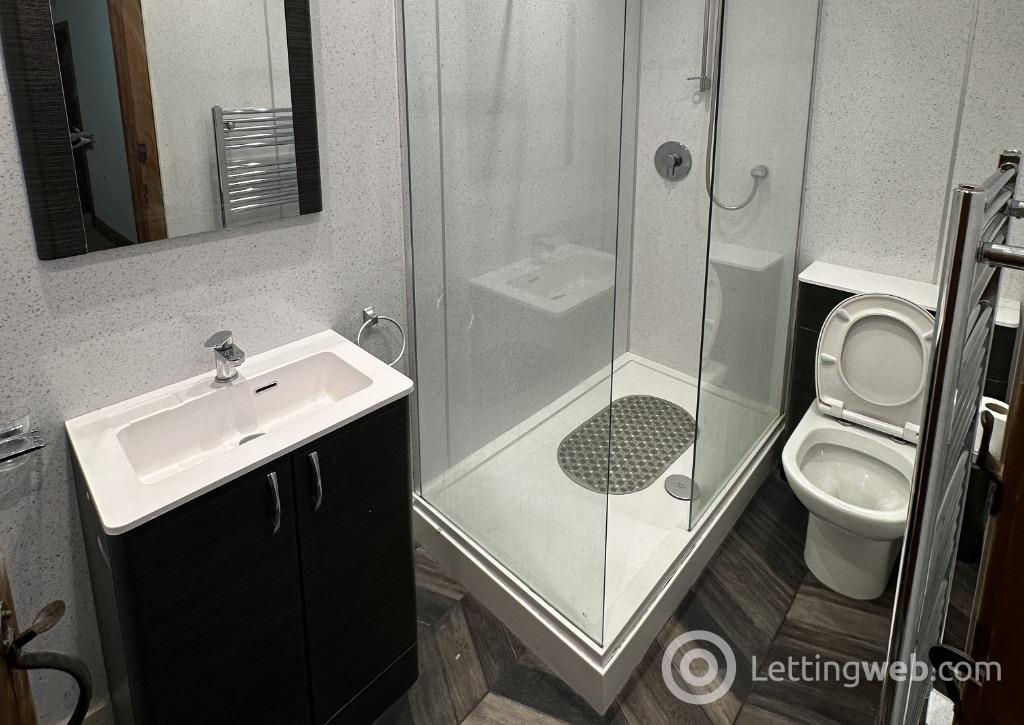 White suite comprising large walk in shower, WC and Wash hand basin with vanity unit. Wall mirror. Vinyl flooring.