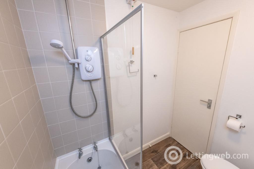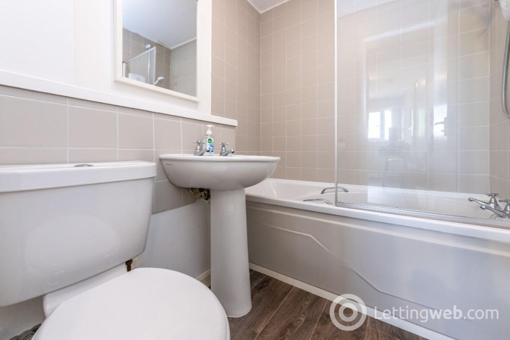 Bathroom: Bathroom with white suite comprising bath with over head shower, sink and WC. Glass shower screen. Vinyl flooring.