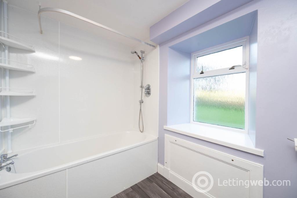 Bathroom: Comprising white suite with Wash Hand Basin, WC and Bath with overhead shower; Aqua panelled round bath; Window to the rear; Laminate flooring; Corner shelving unit on bath.
