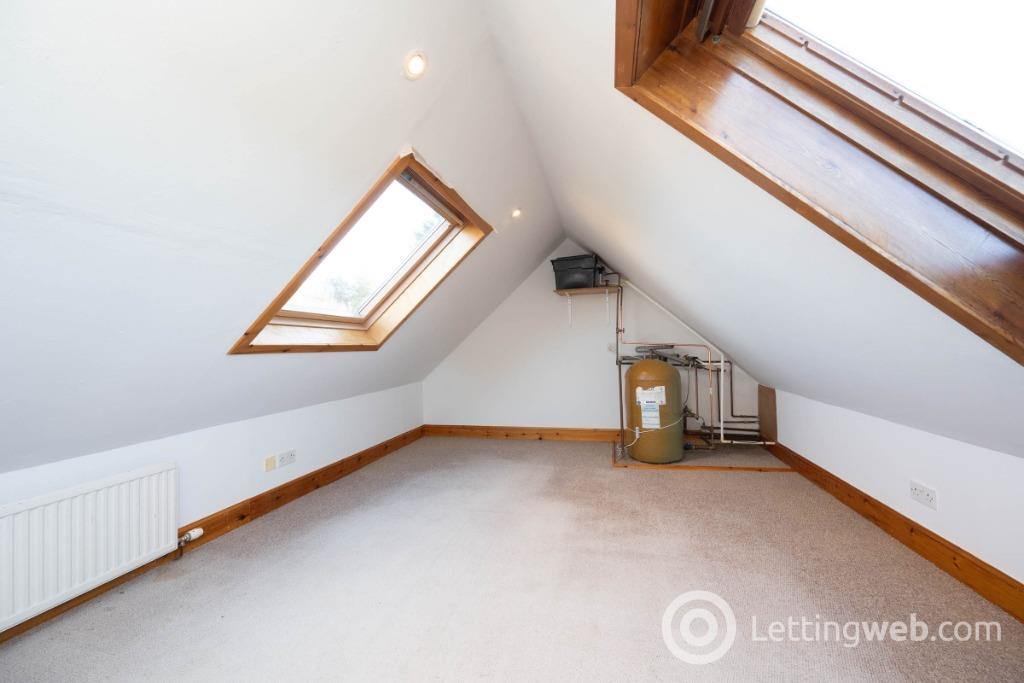 Attic Space: Staircase leading from kitchen to attic storage space and hot water tank. Velux windows to front and back.