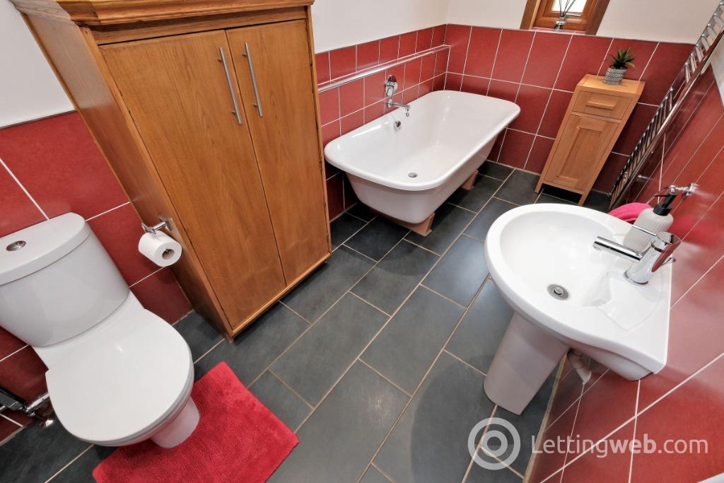 Bathroom: Comprising white suite with Wash Hand Basin, WC, free standing Bath and separate shower cubicle; Red tiling throughout; Window to the side; Tiled flooring. Storage Unit.