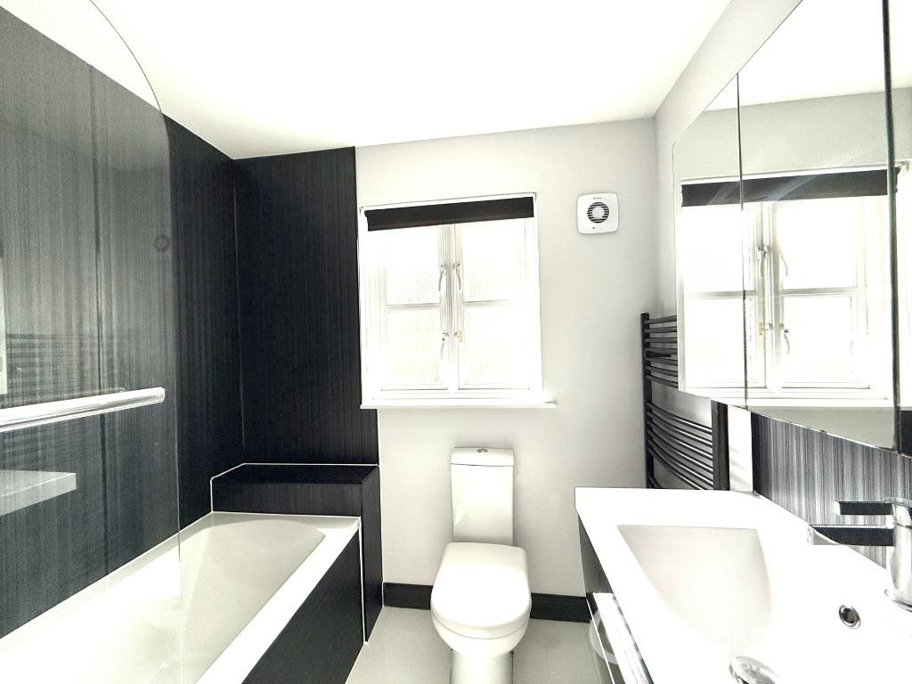 Bathroom: 2.09m x 1.90m (6’10â x 6’3â) approx. Fitted with a white suite comprising WC, wash hand basin and bath with overhead shower. Grey aqua panelling around bath. Handy storage cupboard. Heated towel rail.
